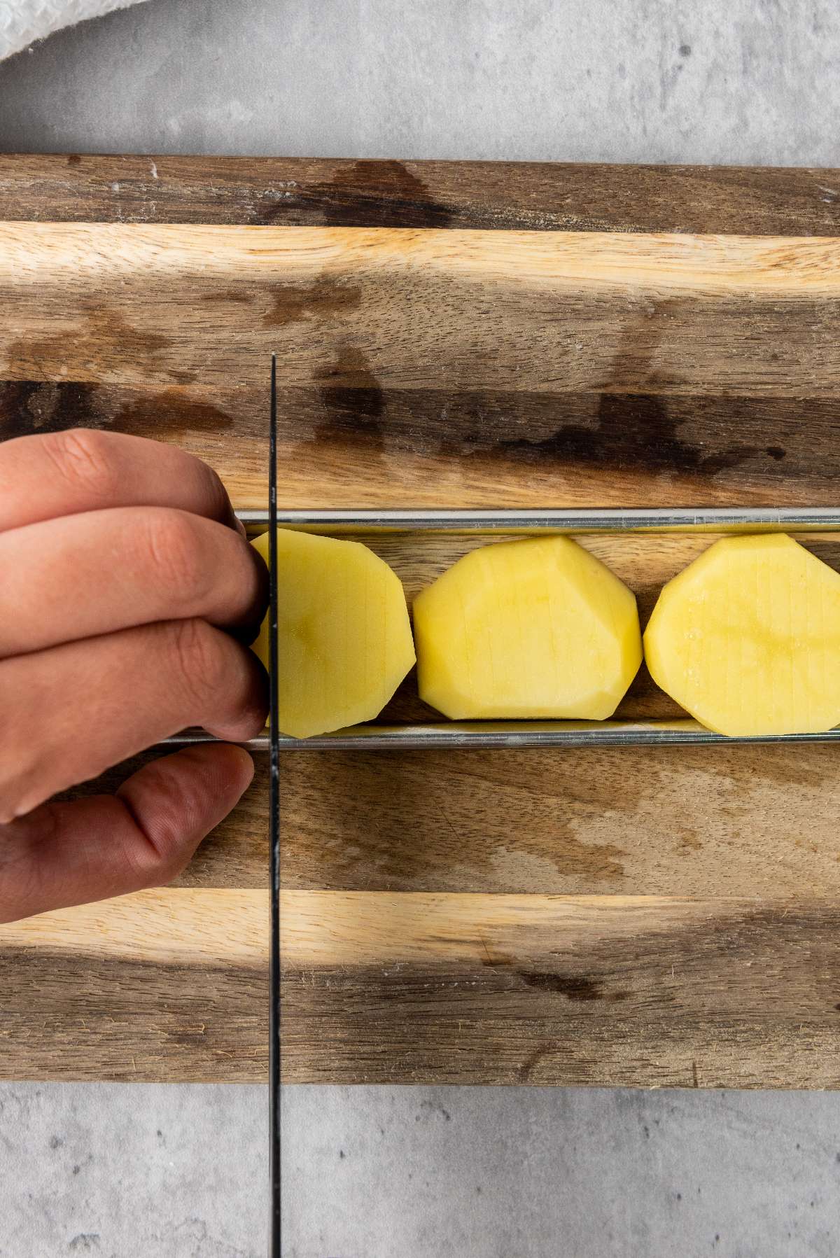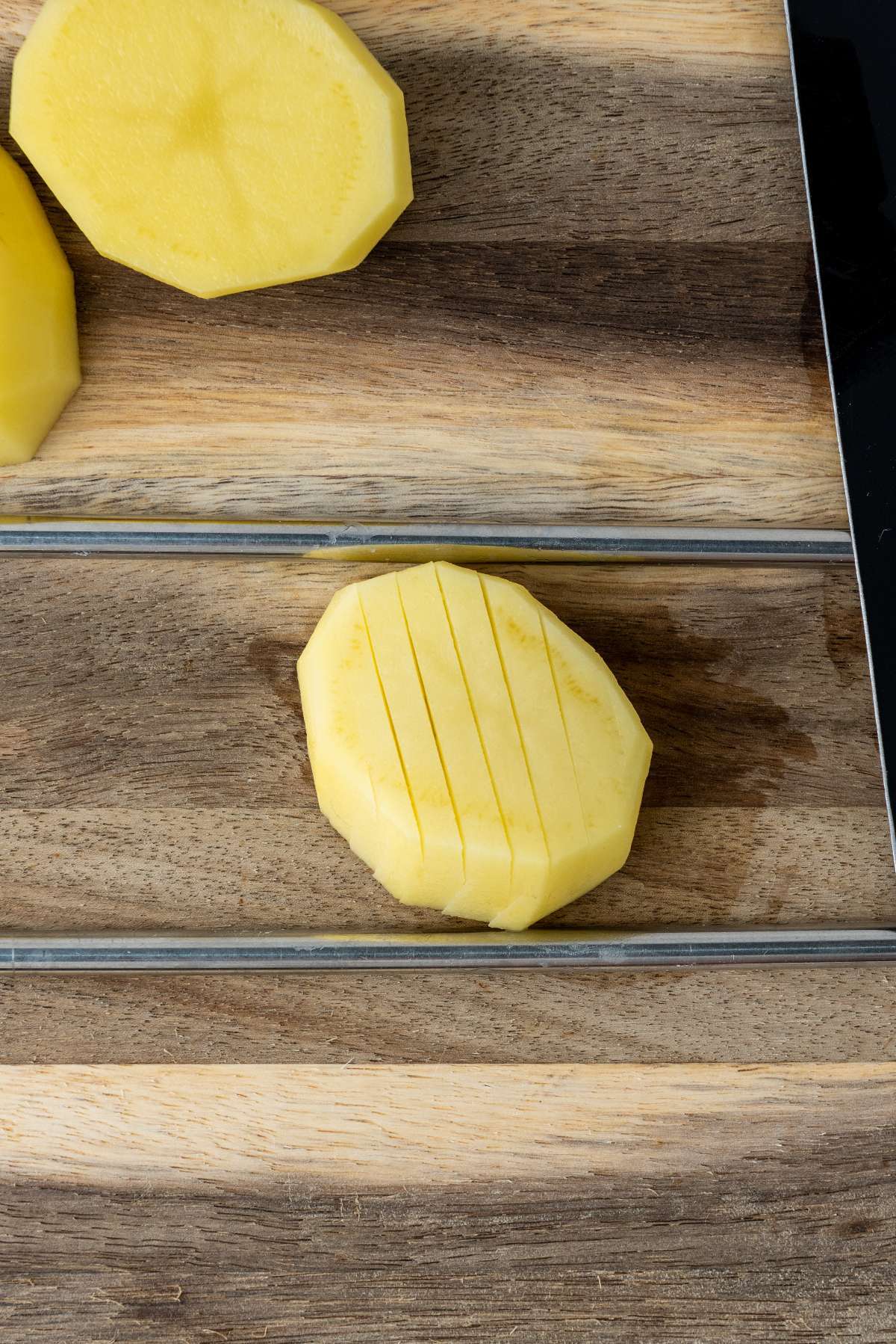 Repeat this until you have made the cuts on every potato slice.