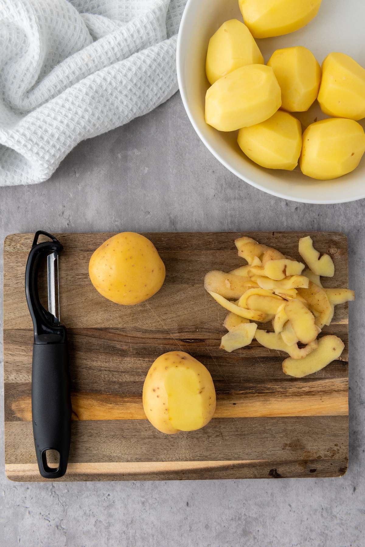 To get started on your accordion potatoes, you will want to peel the potatoes using a