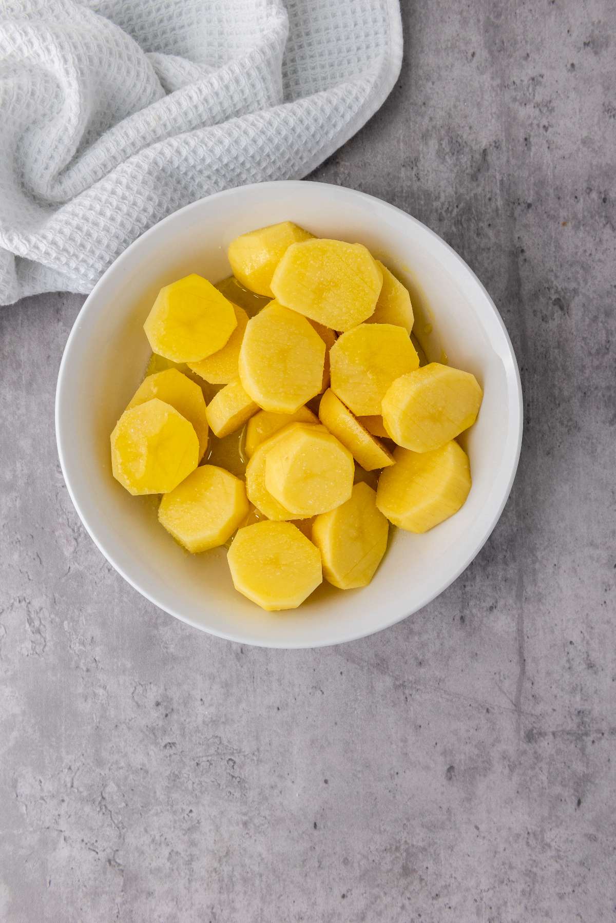 After all of your potatoes are cut, rinse the potatoes under cold water and then carefully pat them dry using