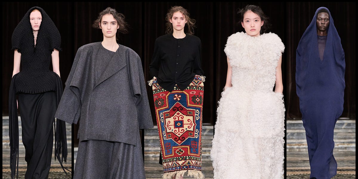 This season, the 2026 LVMH Prize semifinalist employed Azerbaijani weavers (he is also of Azerbaijani descent) to apply their labor-intensive techniques of hand-knotting on a vertical loom to three special show pieces. These carpets are easily recognizable in the collection; Gassanoff doesn’t want to disguise their origins. He lets these carpets look like carpets even when wrapped around the model like a skirt and paired with a cardigan. Surrealist takes on craft continue to take center stage throughout the collection: double-faced wool shaped into sculptural outerwear and hand-stitched shoelaces that join together to create a skirt.