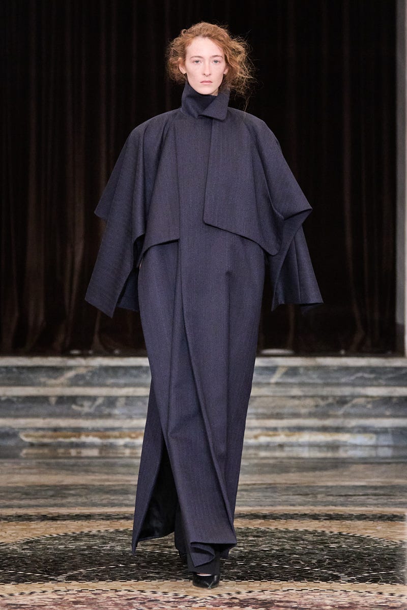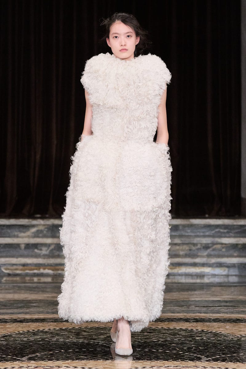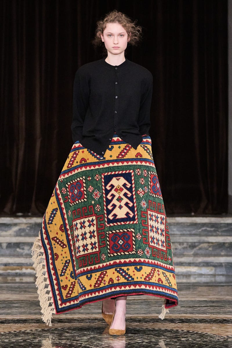 This season, the 2026 LVMH Prize semifinalist employed Azerbaijani weavers (he is also of Azerbaijani descent) to apply their labor-intensive techniques of hand-knotting on a vertical loom to three special show pieces. These carpets are easily recognizable in the collection; Gassanoff doesn’t want to disguise their origins. He lets these carpets look like carpets even when wrapped around the model like a skirt and paired with a cardigan. Surrealist takes on craft continue to take center stage throughout the collection: double-faced wool shaped into sculptural outerwear and hand-stitched shoelaces that join together to create a skirt.