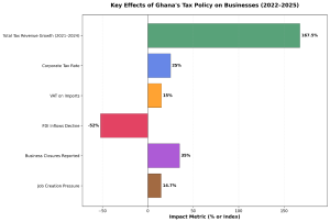 Figure 2: Summary of Tax Policy Impacts – Higher revenue vs. business strain. Recent tax hikes have boosted government coffers but squeezed corporate margins, dampened consumer spending and job creation, and shaken investor confidence. Some measures were eased in 2025 (e.g., the repeal of the E-levy), but the cumulative burden over 2022–2024 has been a major concern for Ghana’s private sector.