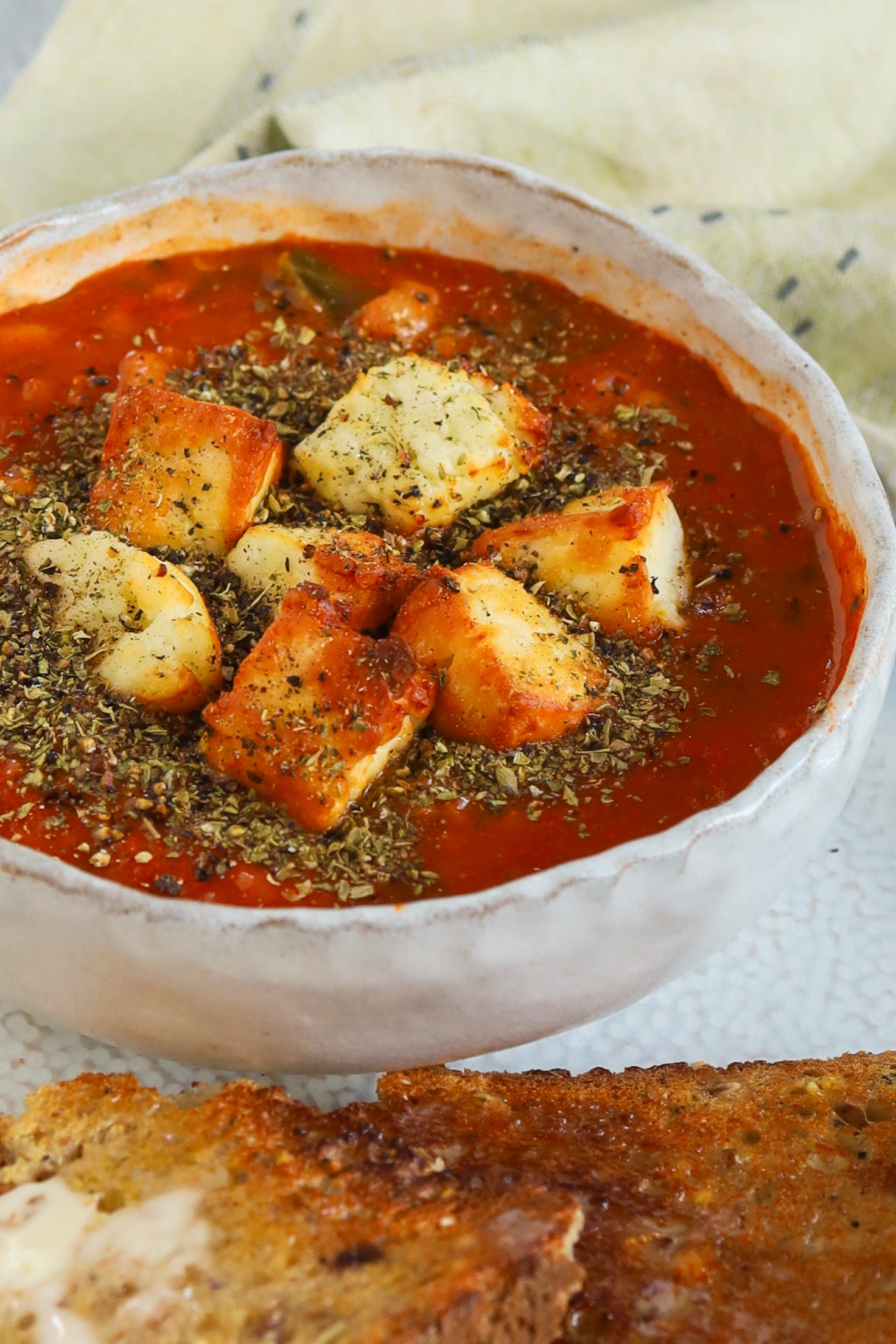 Mediterranean vegetable soup with halloumi ‘croutons’